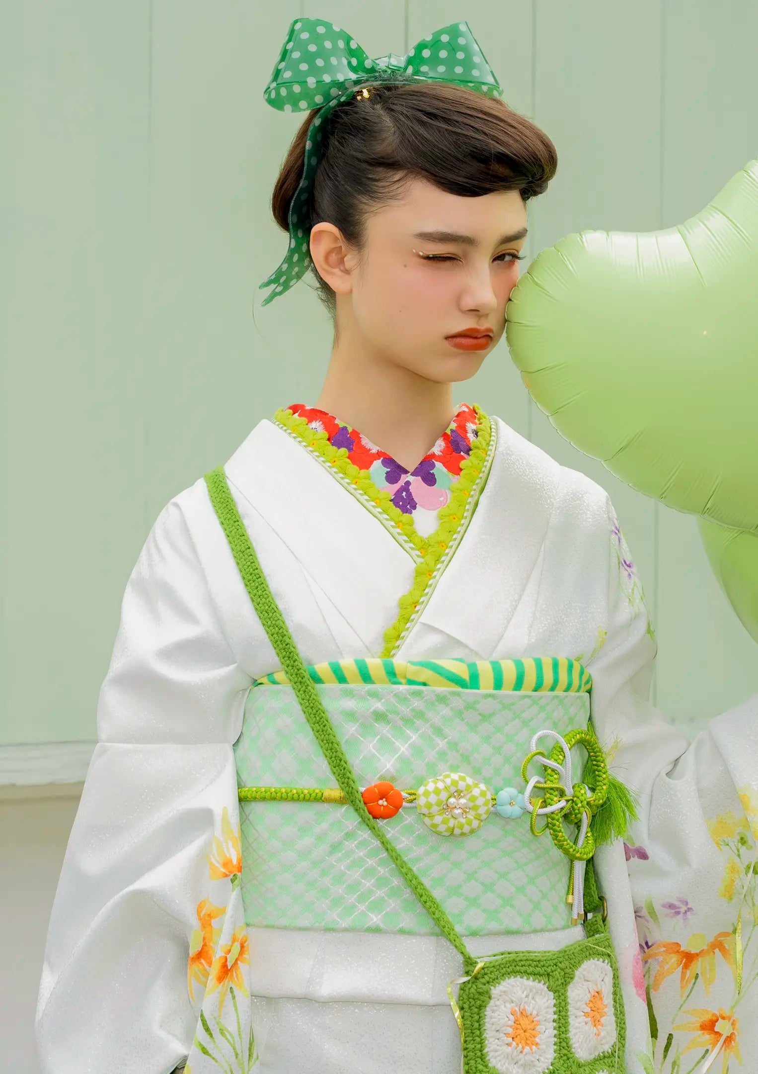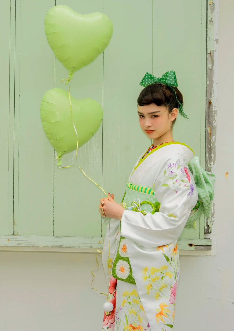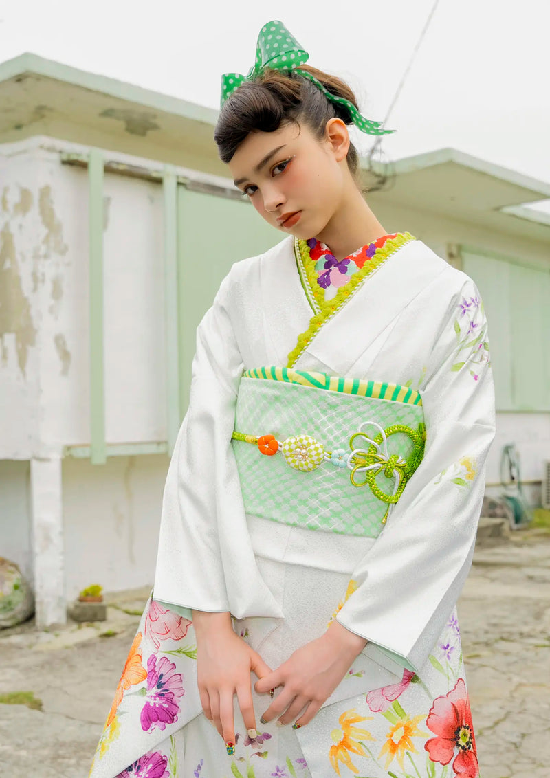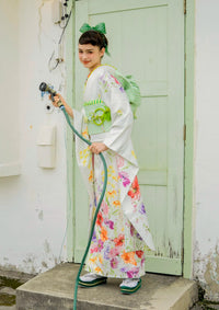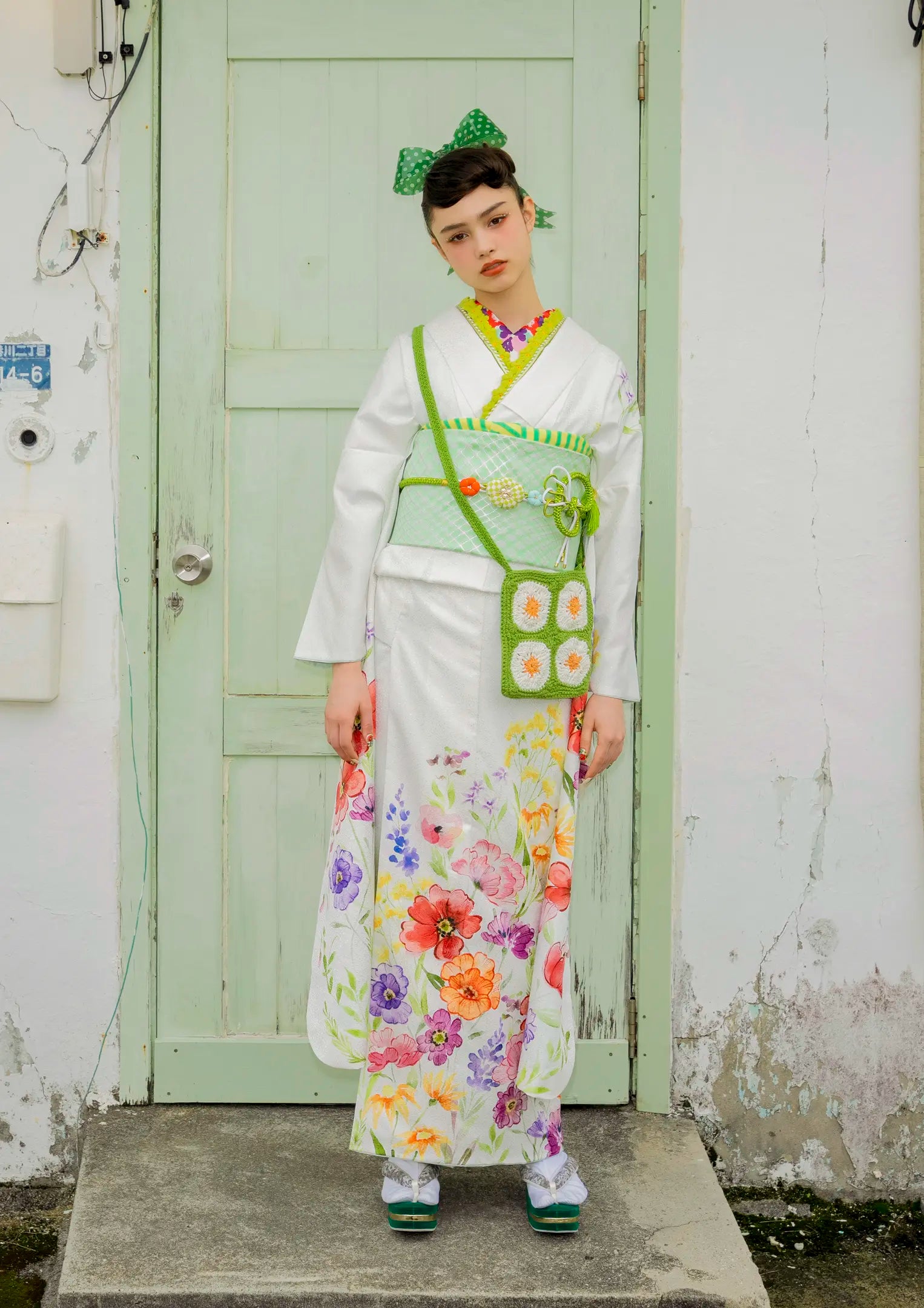 真っ白な地に、みずみずしい水彩タッチで描かれた洋花が印象的なキモノハーツオリジナルの振袖。 赤や紫、黄色などのカラフルな花々が咲き誇り、まるで一枚のアートのような美しさをまとえる一着です。 白振袖ならではの清楚さに、可憐で個性的なデザインが映えます。