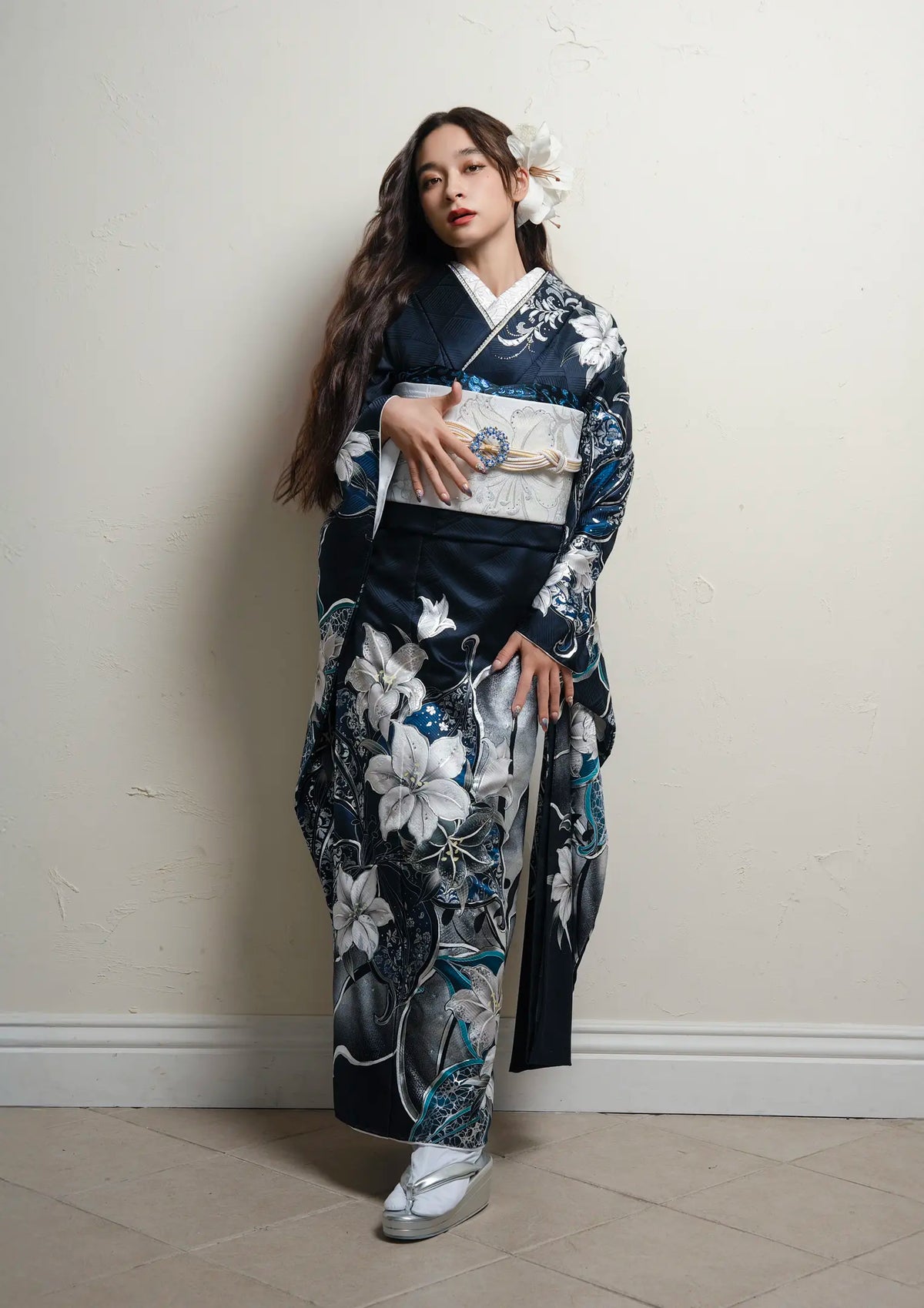 【振袖ネットレンタル:深い青に百合】気高く上品に/KH-523