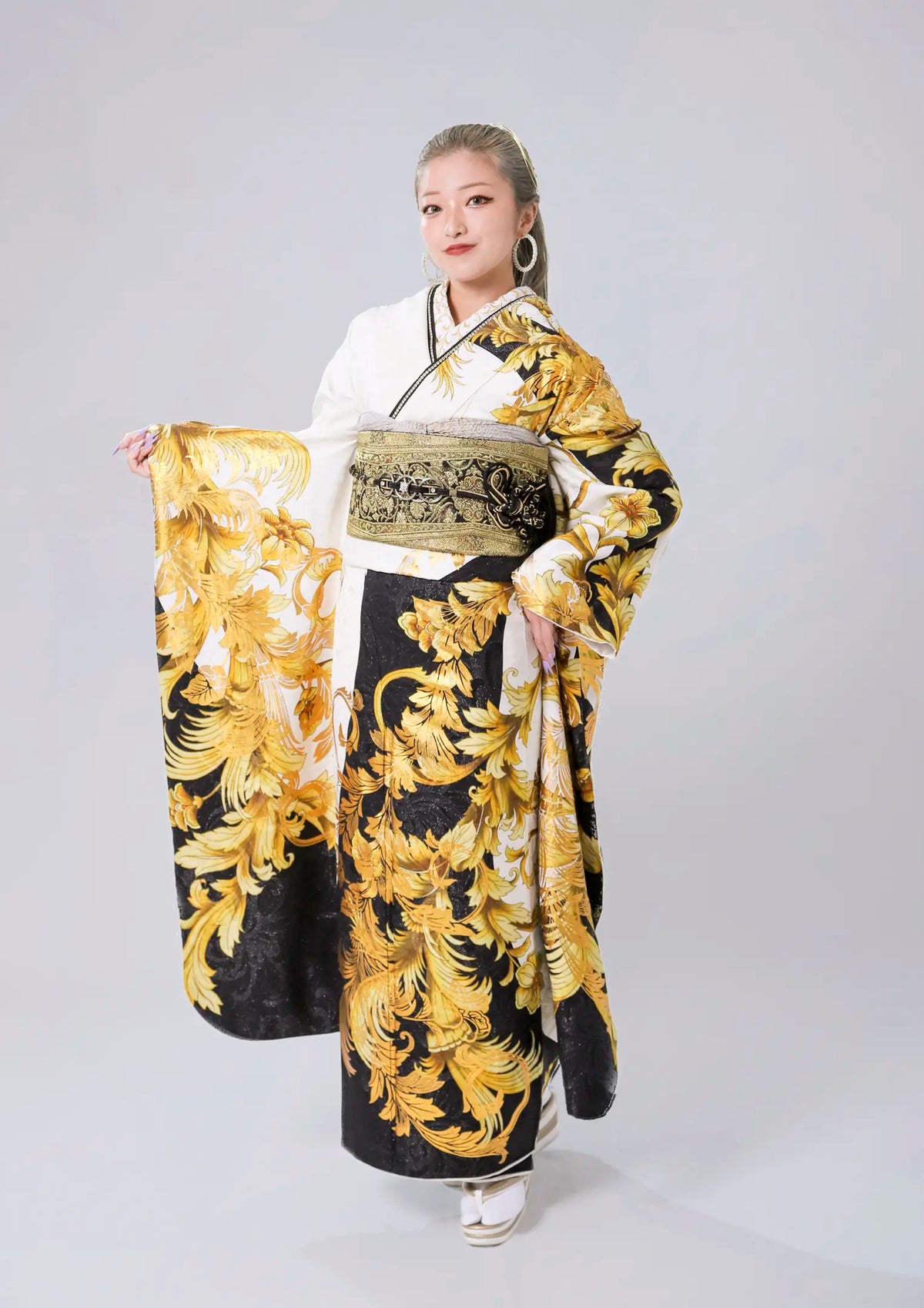 【振袖ネットレンタル:白とゴールド】煌めきを黒色で引き締めて/KH-371