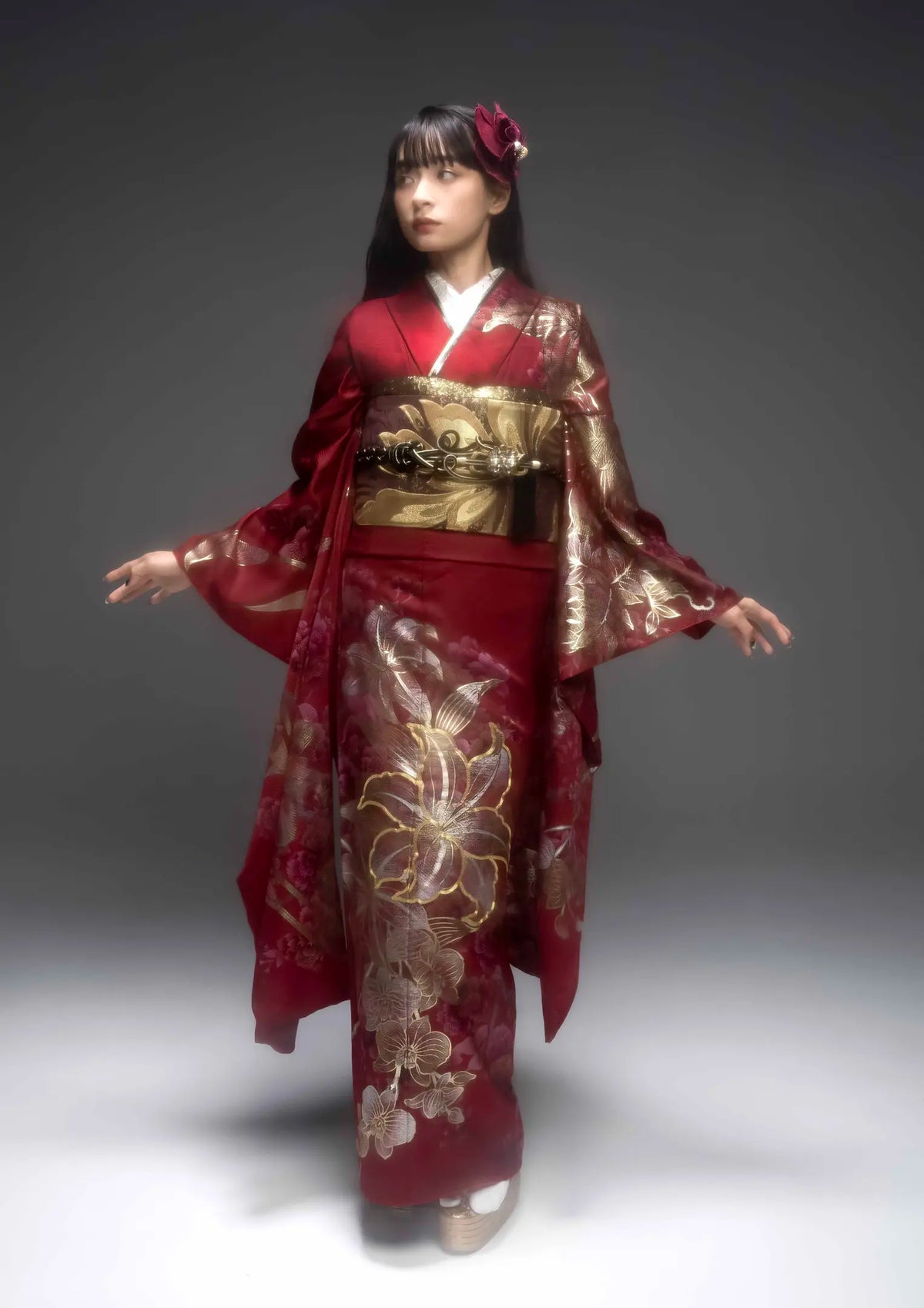 【振袖ネットレンタル】赤色に金の百合が大胆/KH-605