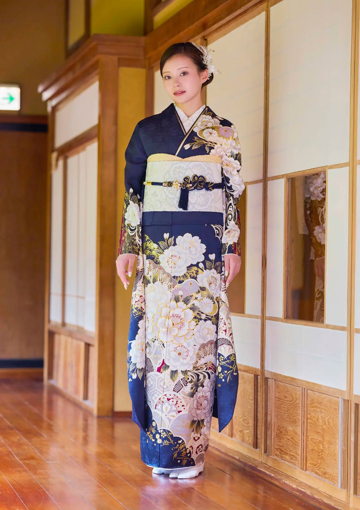 【振袖ネットレンタル: 紺色に華やかな白】華やかな雪夜のような振袖/KH-543