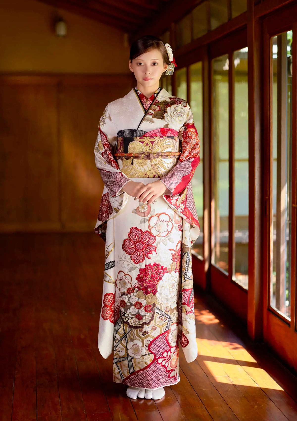 【振袖ネットレンタル】白地に赤で大胆に品よく/KH-599