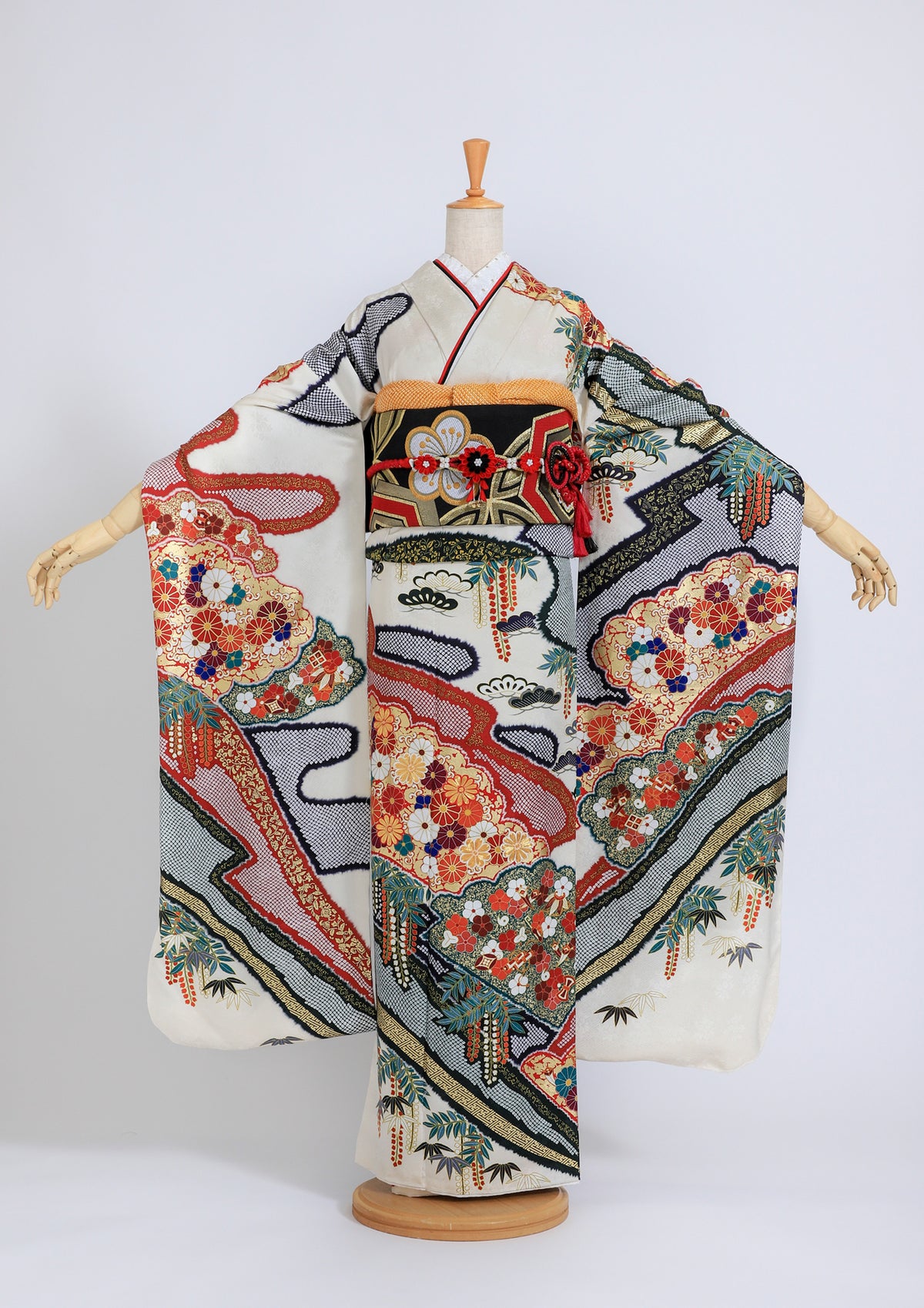 【振袖ネットレンタル:白に黄色】華やかな松竹梅が描かれている/KH-247