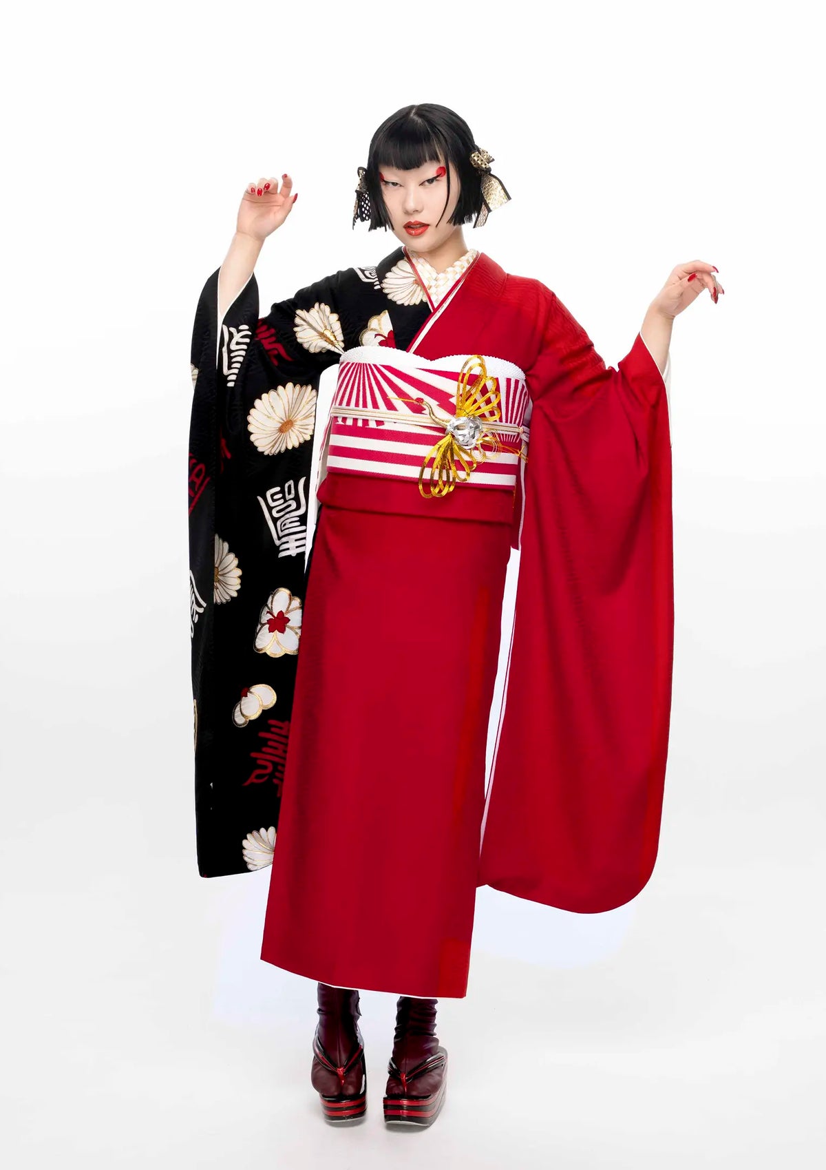 【振袖ネットレンタル:赤と黒の片身替わり】オリエンタルな個性派デザイン/KH-616