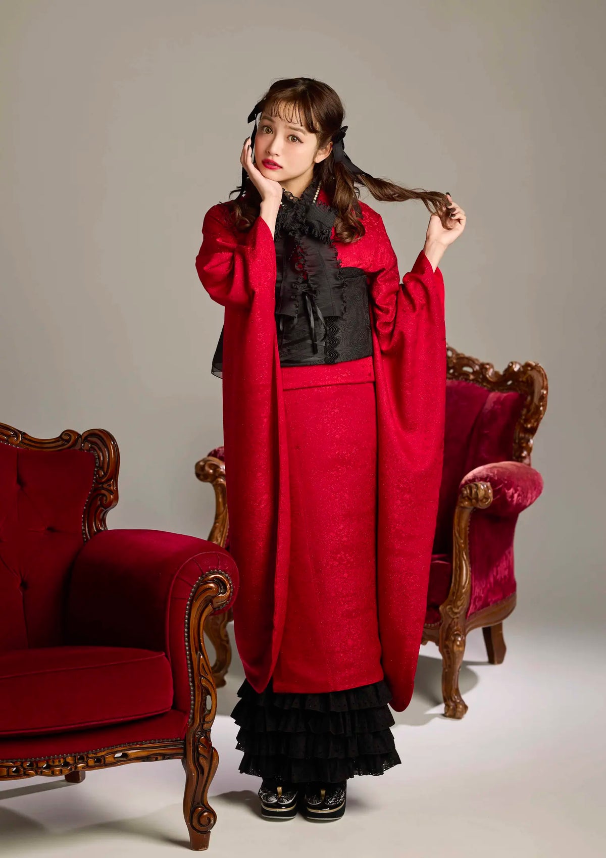 【振袖ネットレンタル:赤の無地】シンプルだからこそレースやリボンの映える洋風コーデ/KH-252