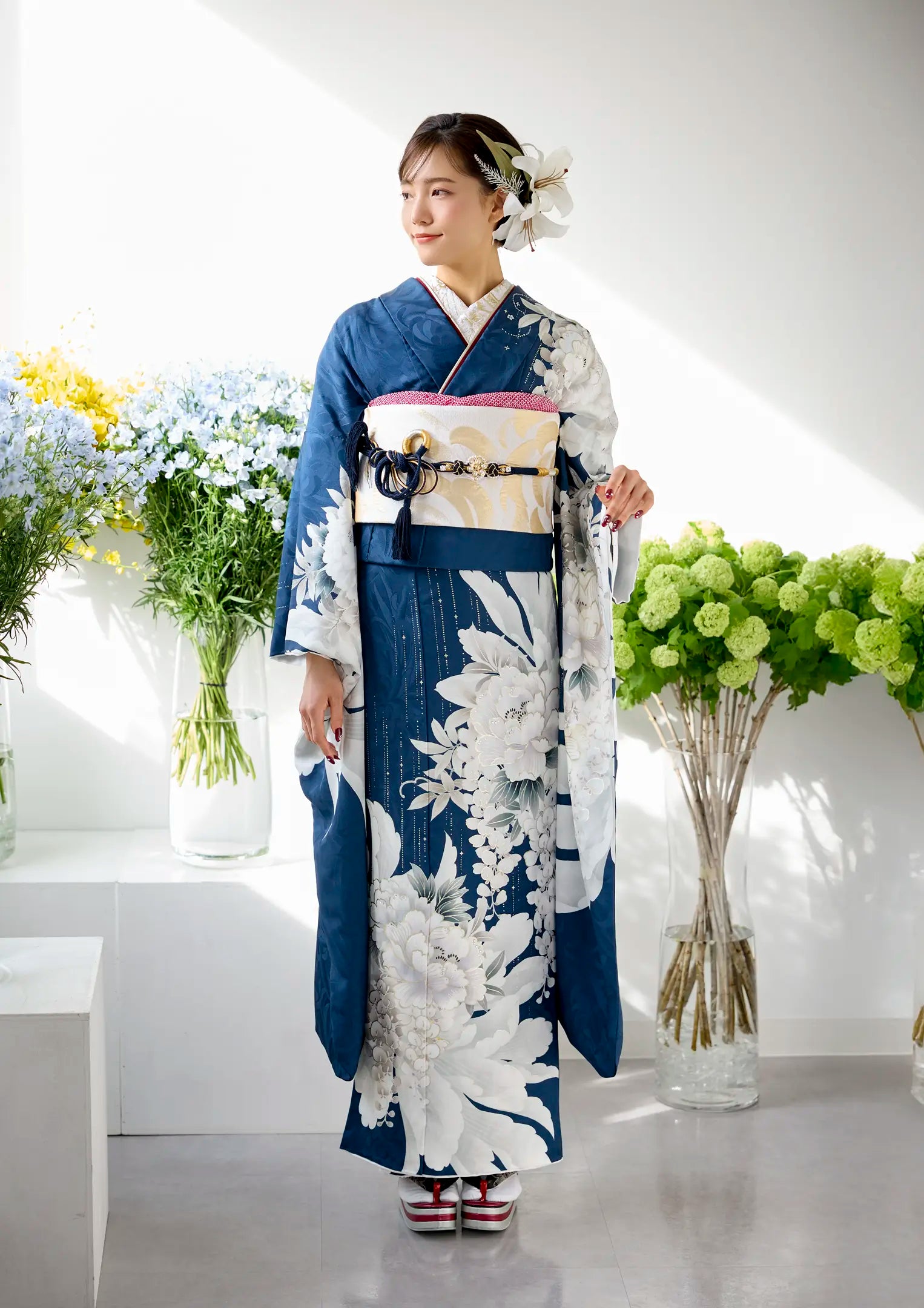 美しい青地に白い牡丹や藤の花々が大きく描かれた印象的な振袖。 青と白のみで構成されたキモノハーツだけの色使いが、洗練された美しさを際立たせます。 上品な白×金の帯に、赤い絞りの帯揚げで可愛らしさを添えて。