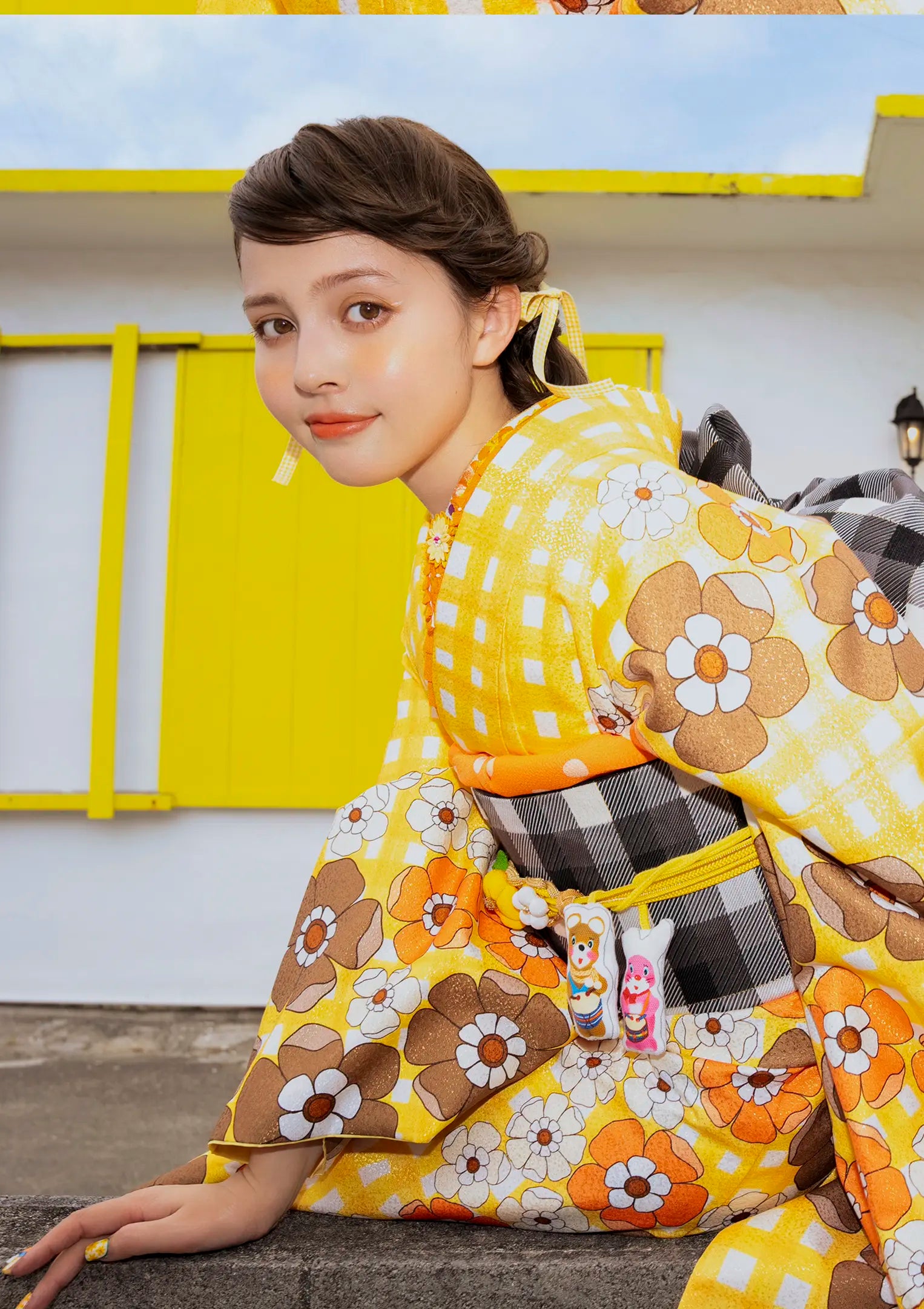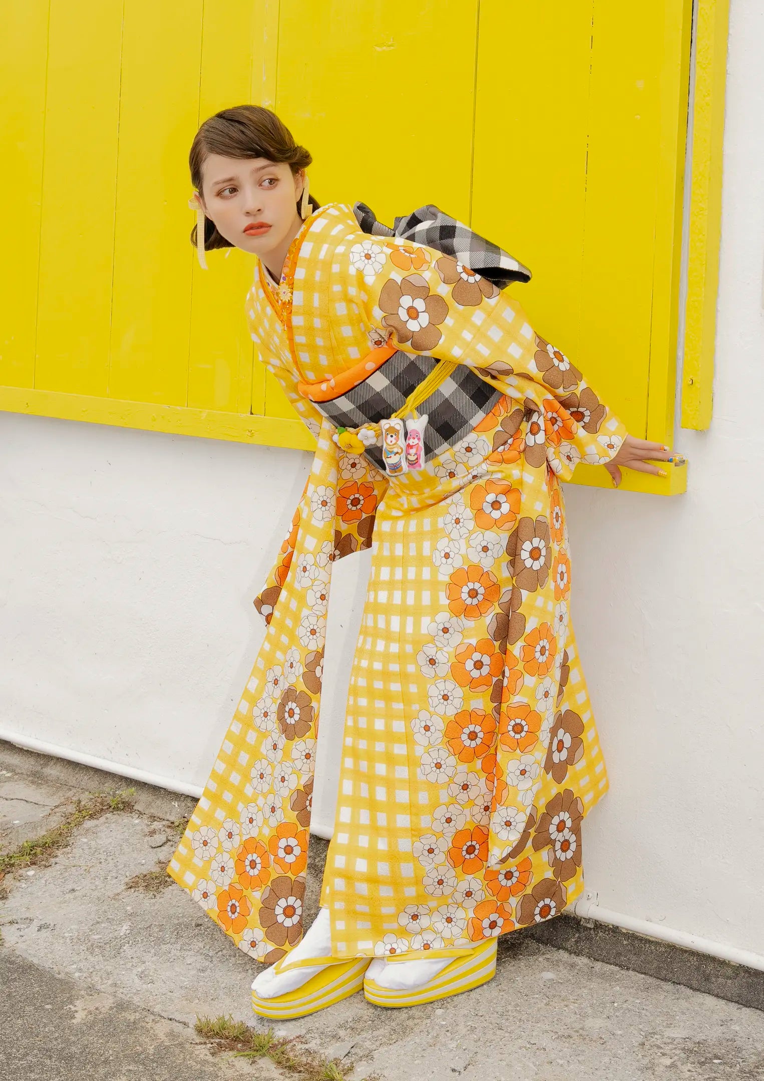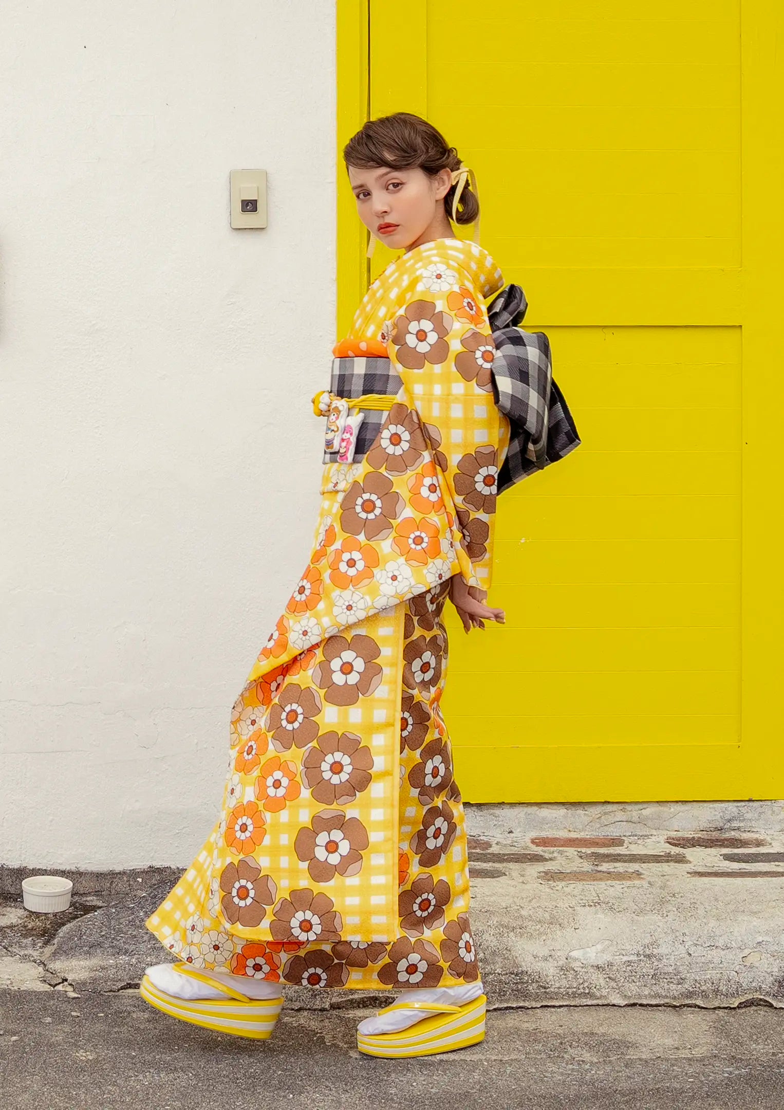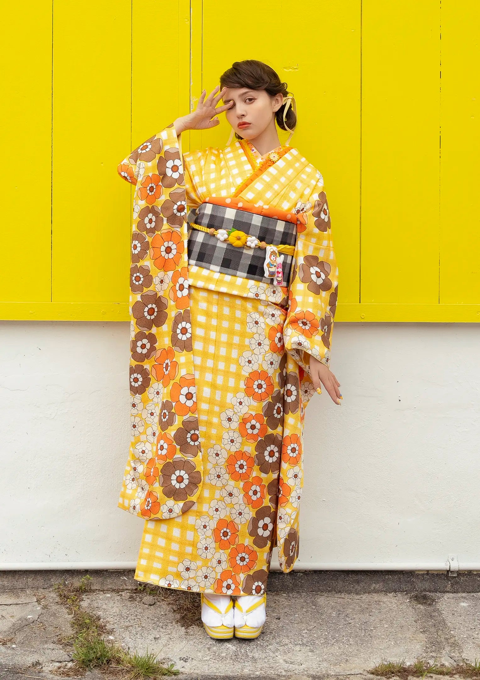 【振袖ネットレンタル:イエローチェック】昭和レトロなデザイン/KH-566
