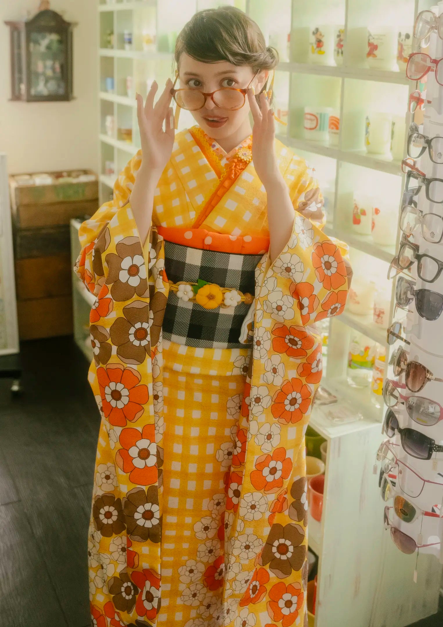 帯は黒色のチェック柄をコーディネート。あえてチェックで揃えることで垢抜け感のある印象に。