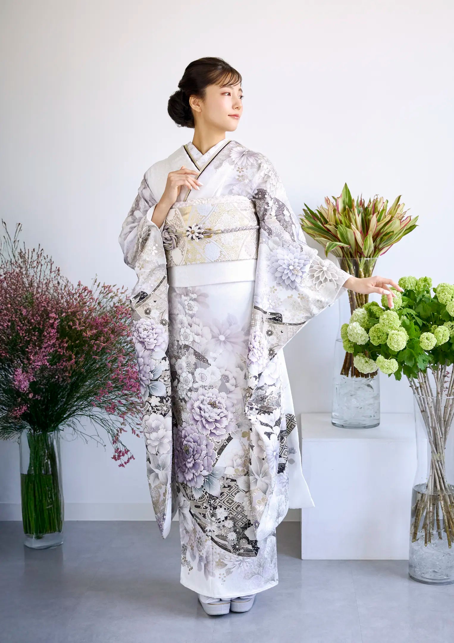 白地を基調に、水墨画のような筆致で描かれた花々が幻想的に広がるキモノハーツオリジナル振袖。 淡いブルーグレーから濃淡をつけた墨色まで、繊細な色使いが奥行きと静謐な美しさを生み出しています。