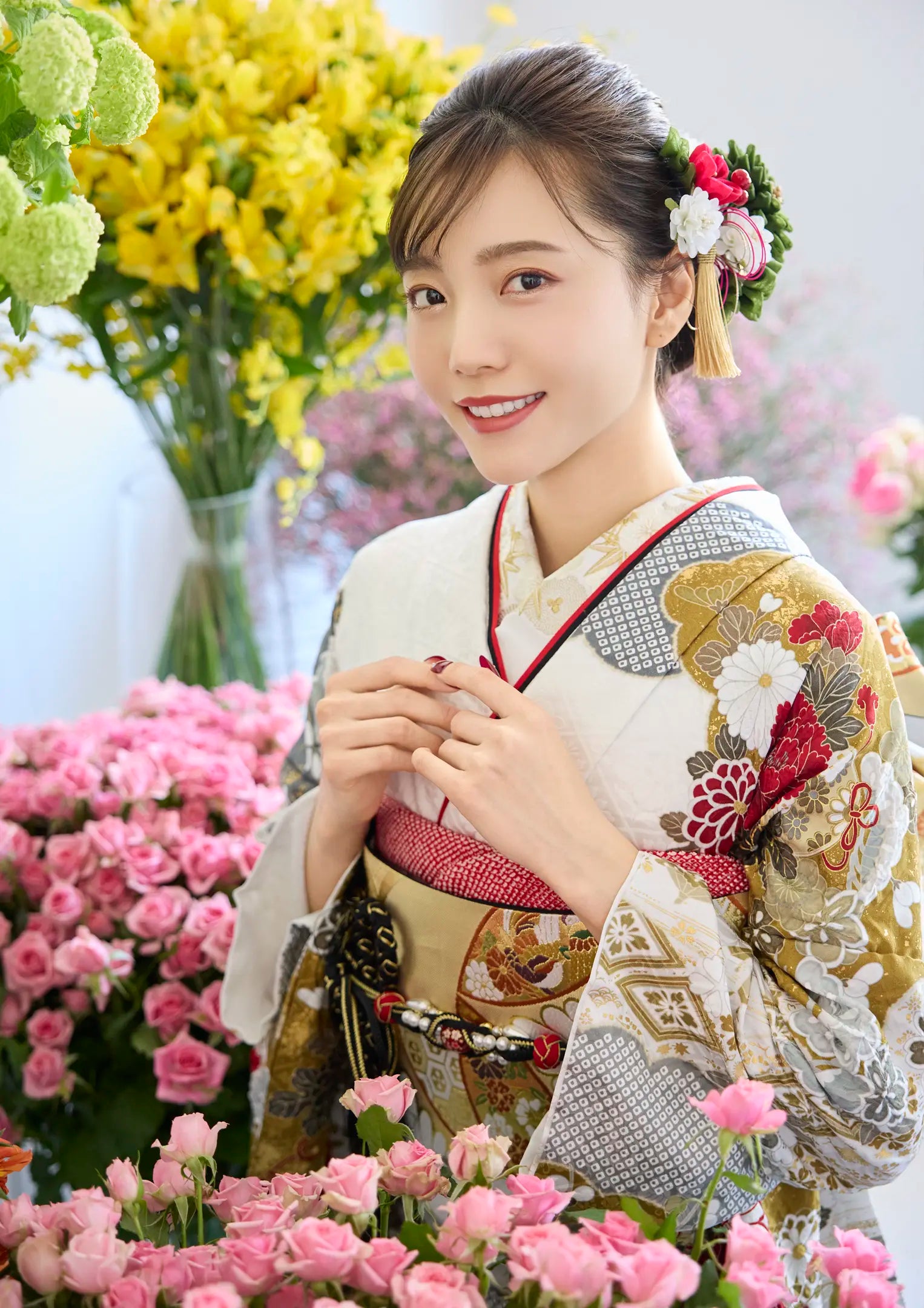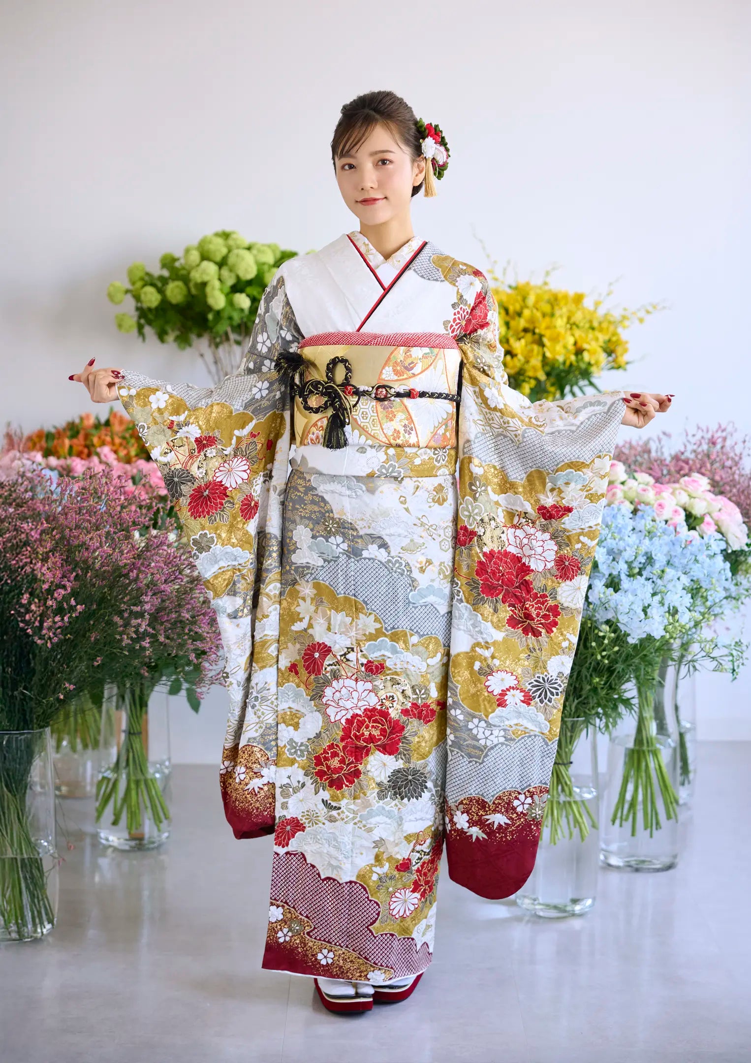 主役は、百花の王とも称される大輪の牡丹。 小さな蕾から、やがて堂々と花開くその花姿は、美しく成長を遂げたお嬢様の姿と重なるのではないでしょうか。 さらに気品ある菊や愛らしい桜、紅葉など、四季折々の名花が散りばめられ、古典柄ならではの華やかさと格調高い美しさが際立ちます。