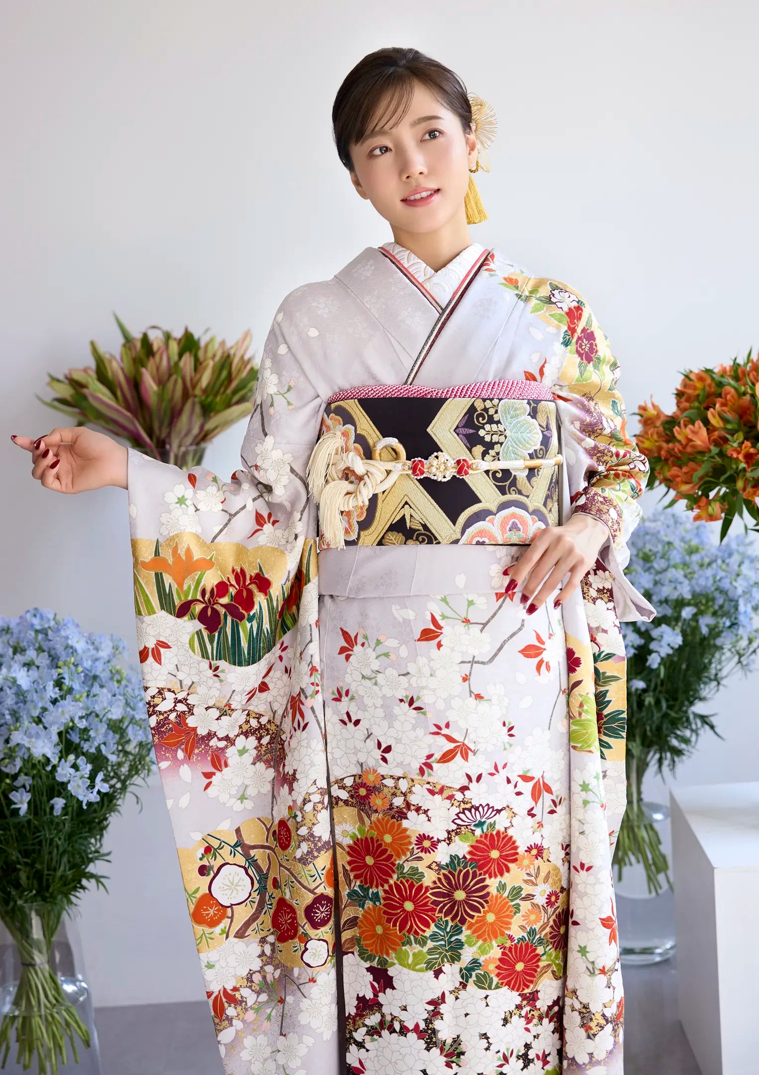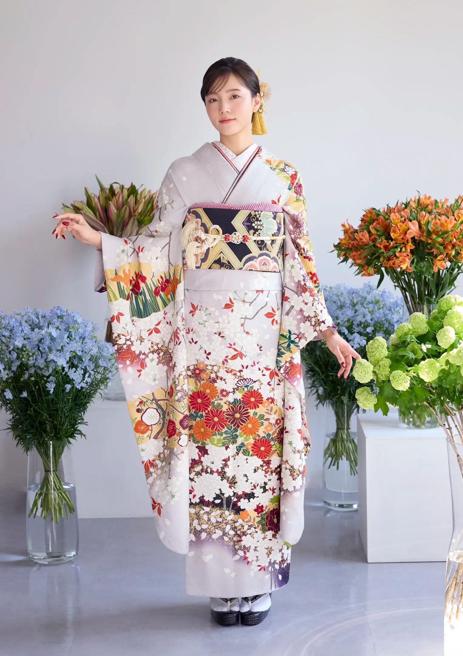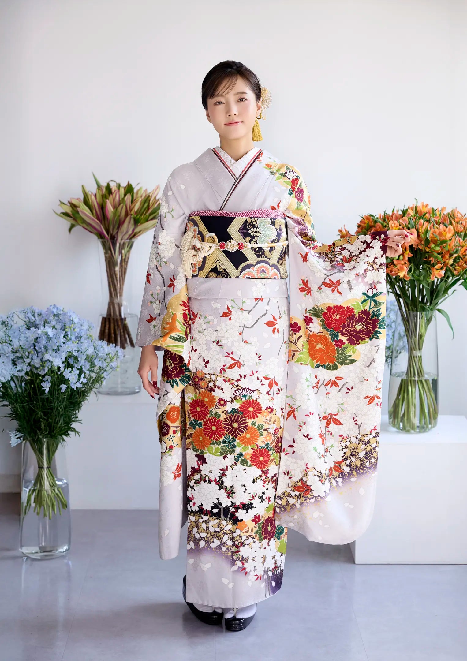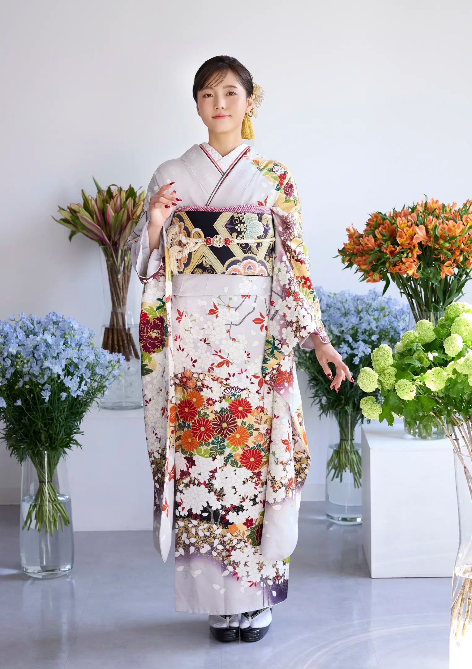 淡い紫地に、白で描かれた満開の桜。澄んだ空気、春霞を感じる雅な逸品です。 赤や橙、紫で描かれた菊や牡丹も華やかで美しい。肩や裾などに施された雲取りの金が上品に煌めき、華やかさを添えます。 すっきりとまとめた髪に金色の髪飾りで上品に仕上げました。