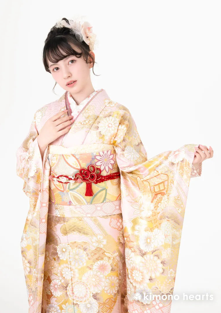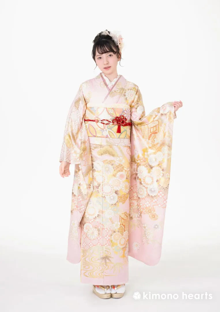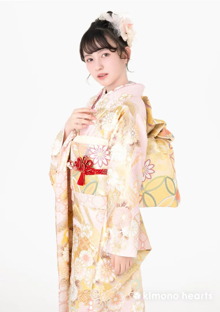 淡い桃色に柔らかな金色で描かれた菊の花が、ふんわりと可憐に咲き誇る振袖。