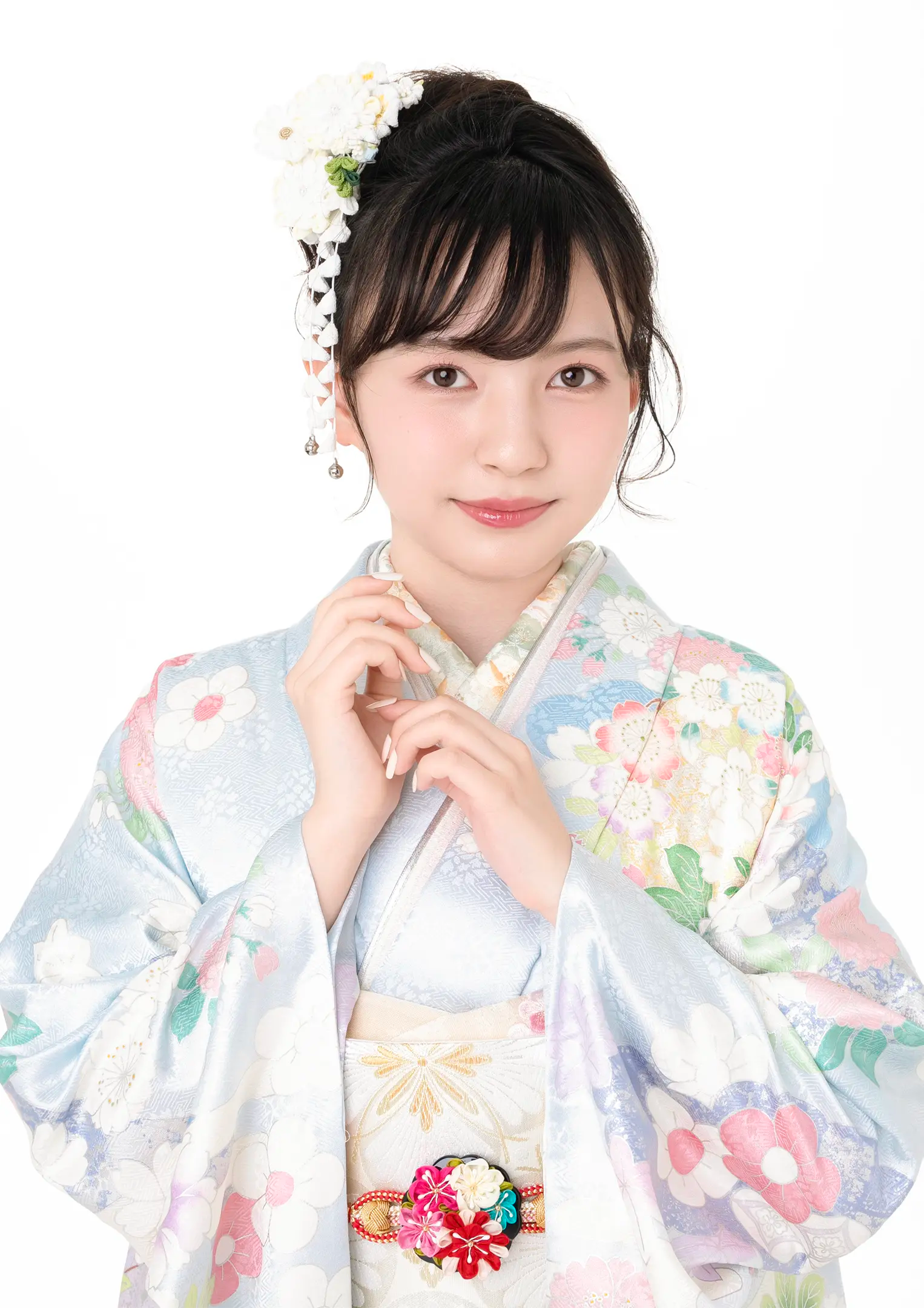 白を基調にしたつまみ細工の髪飾りを高めの位置に飾り、舞妓さん風の上品さを演出。顔のサイドで揺れる藤の花も愛らしい印象です。