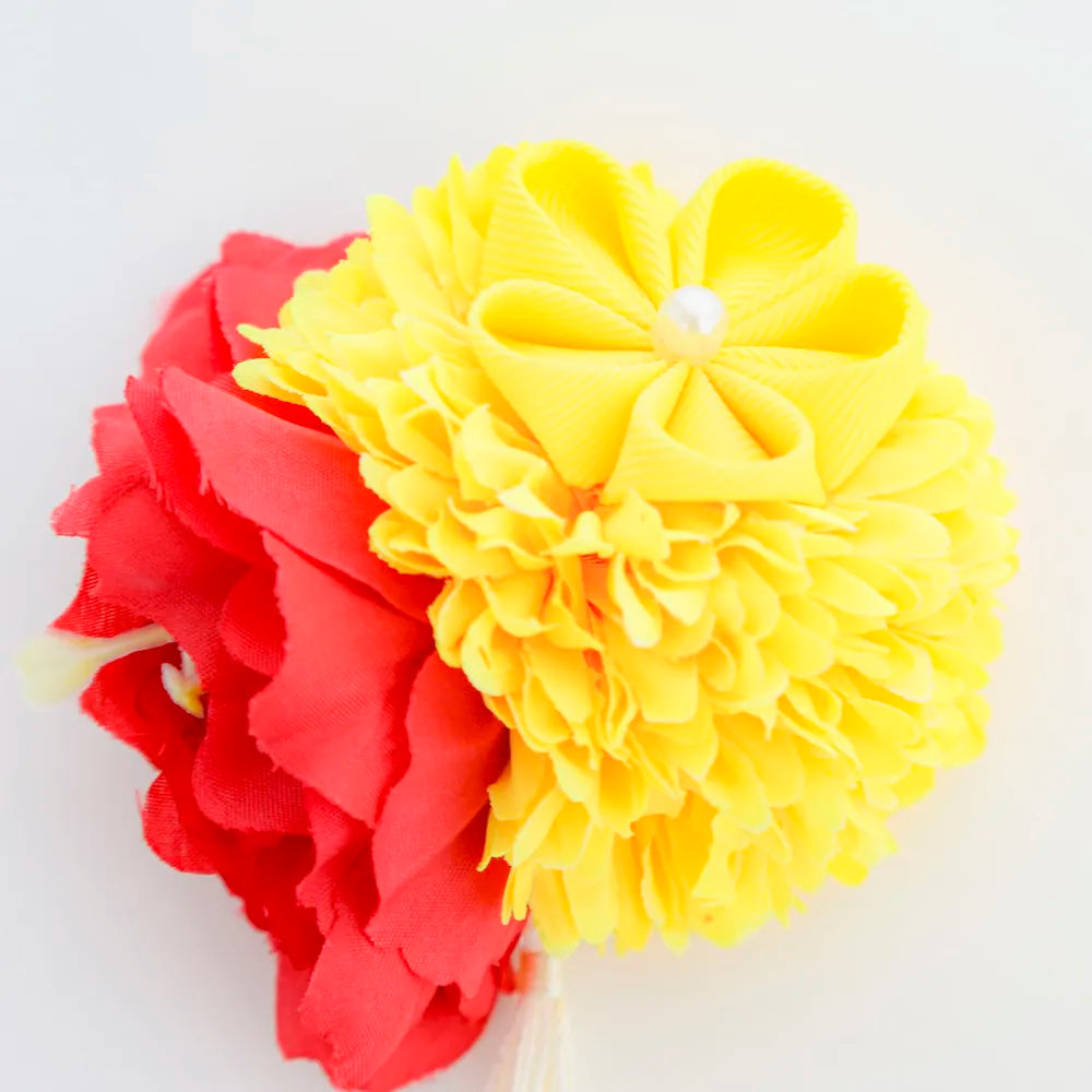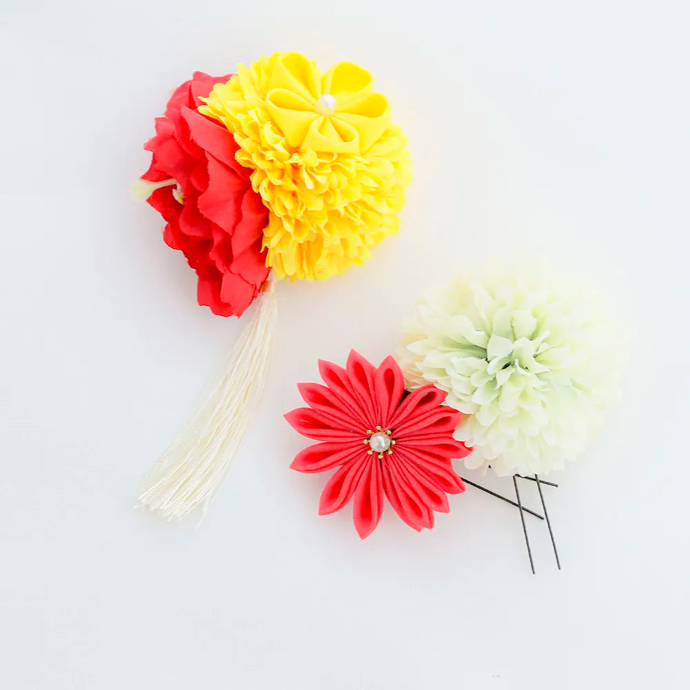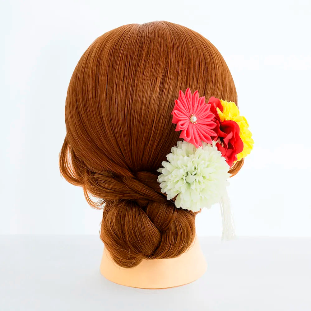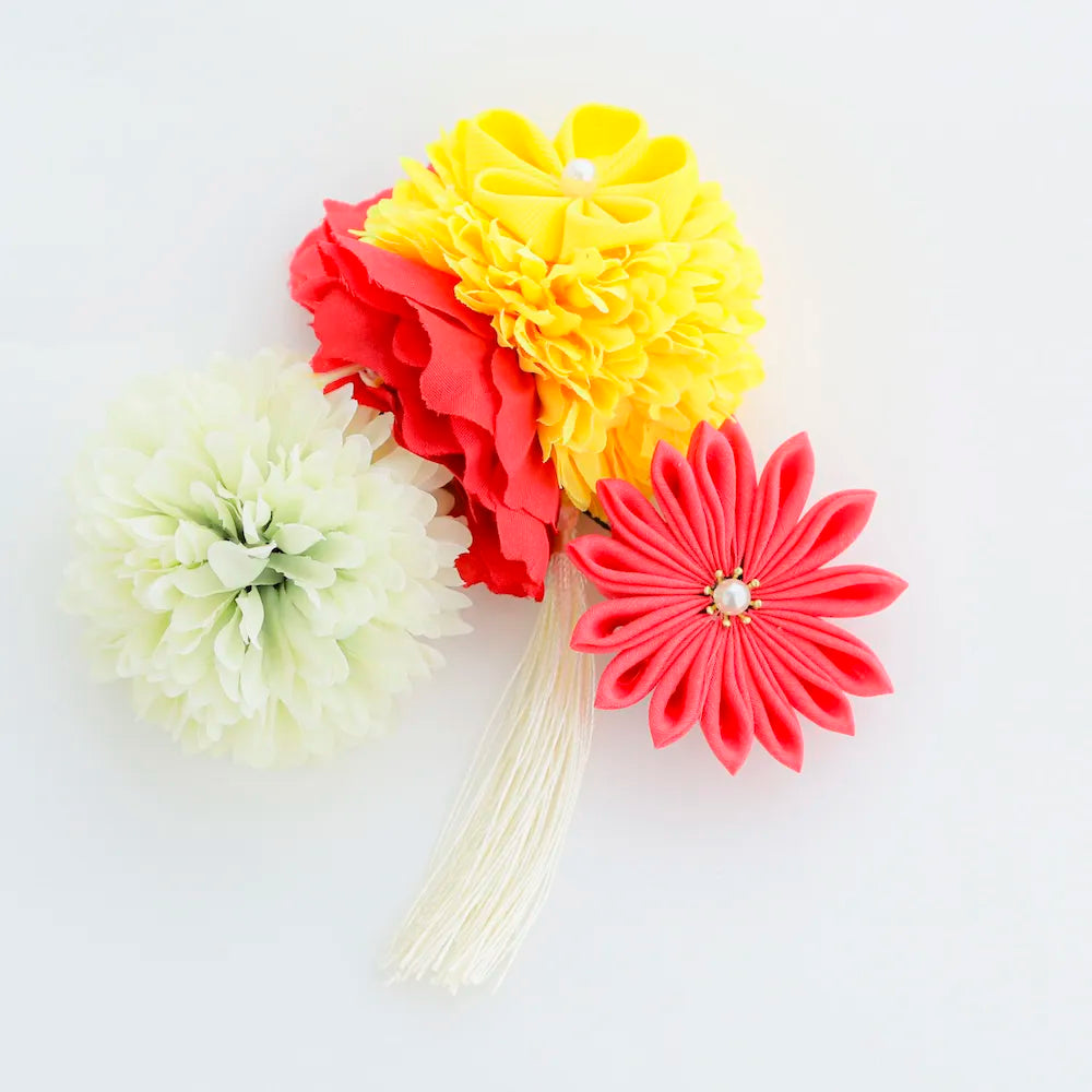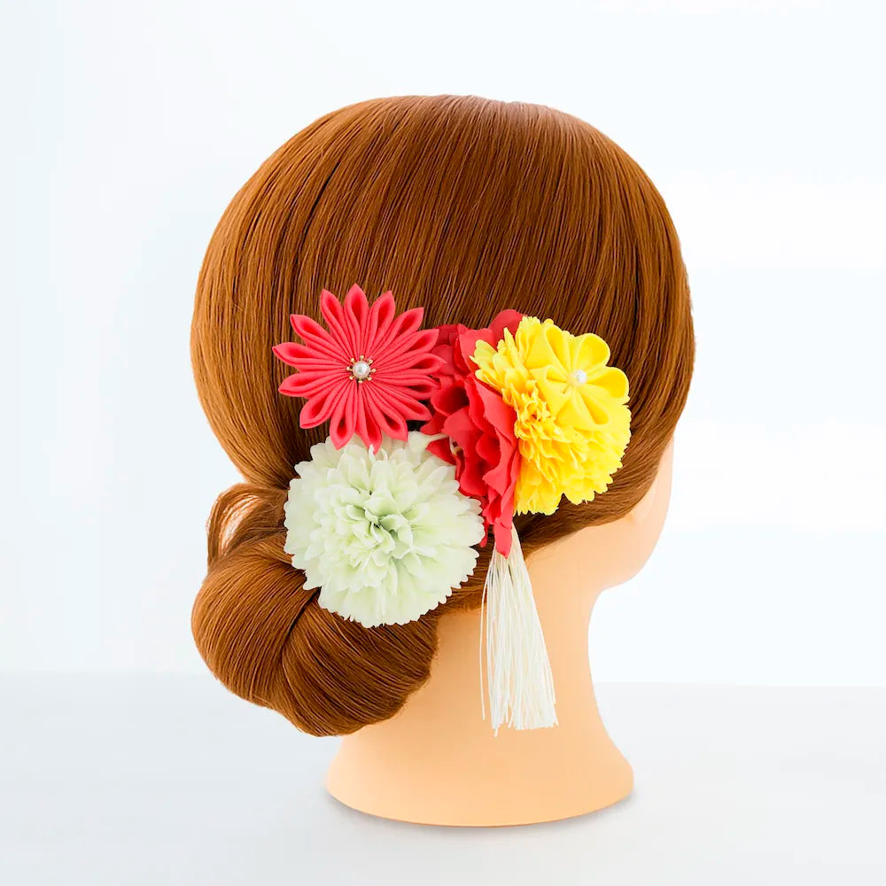 【髪飾り販売:成人式・卒業式に!レッド&イエローマムとつまみフラワーのタッセル付き髪飾りセット】振袖・袴用和装ヘアアクセサリー/hair-028