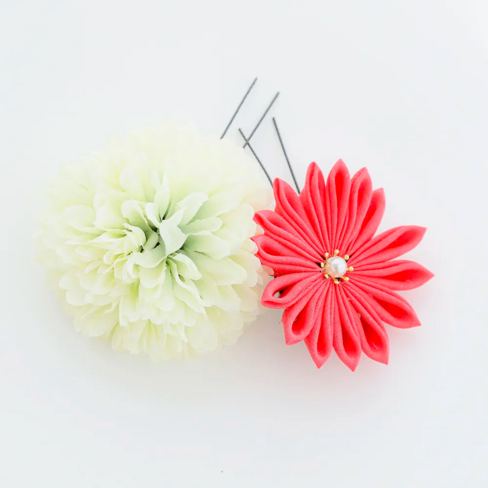 セットのミルキーグリーンのマムと、レッドのつまみ風フラワーUピンは、前髪横やシニヨン周りにプラスするだけで、立体感のあるレトロ可愛いスタイルに。古典柄振袖との相性もばっちりです。