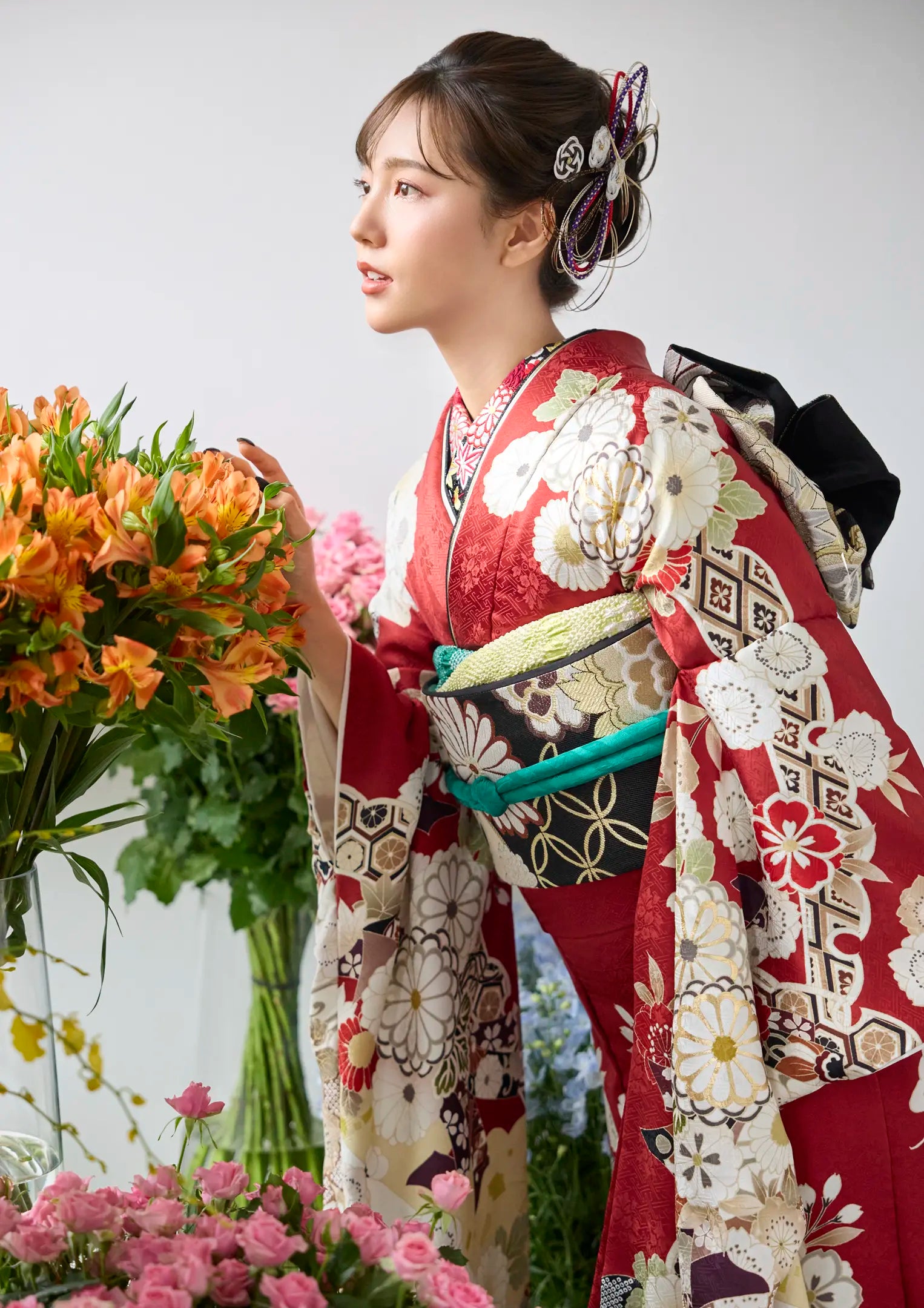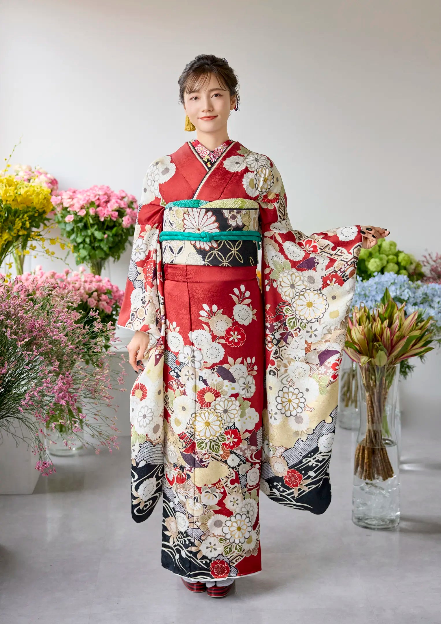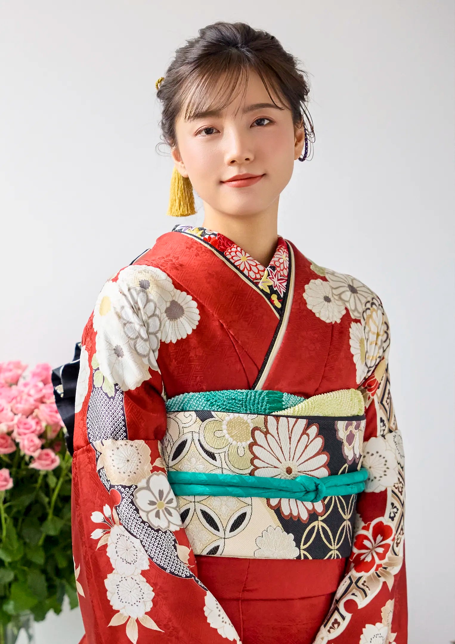 二十歳の健康美を引き立てる、伝統的な赤の振袖。 丸く描かれた桜や菊が愛らしく咲き誇る、可憐さと華やかさを兼ね備えた一枚です。